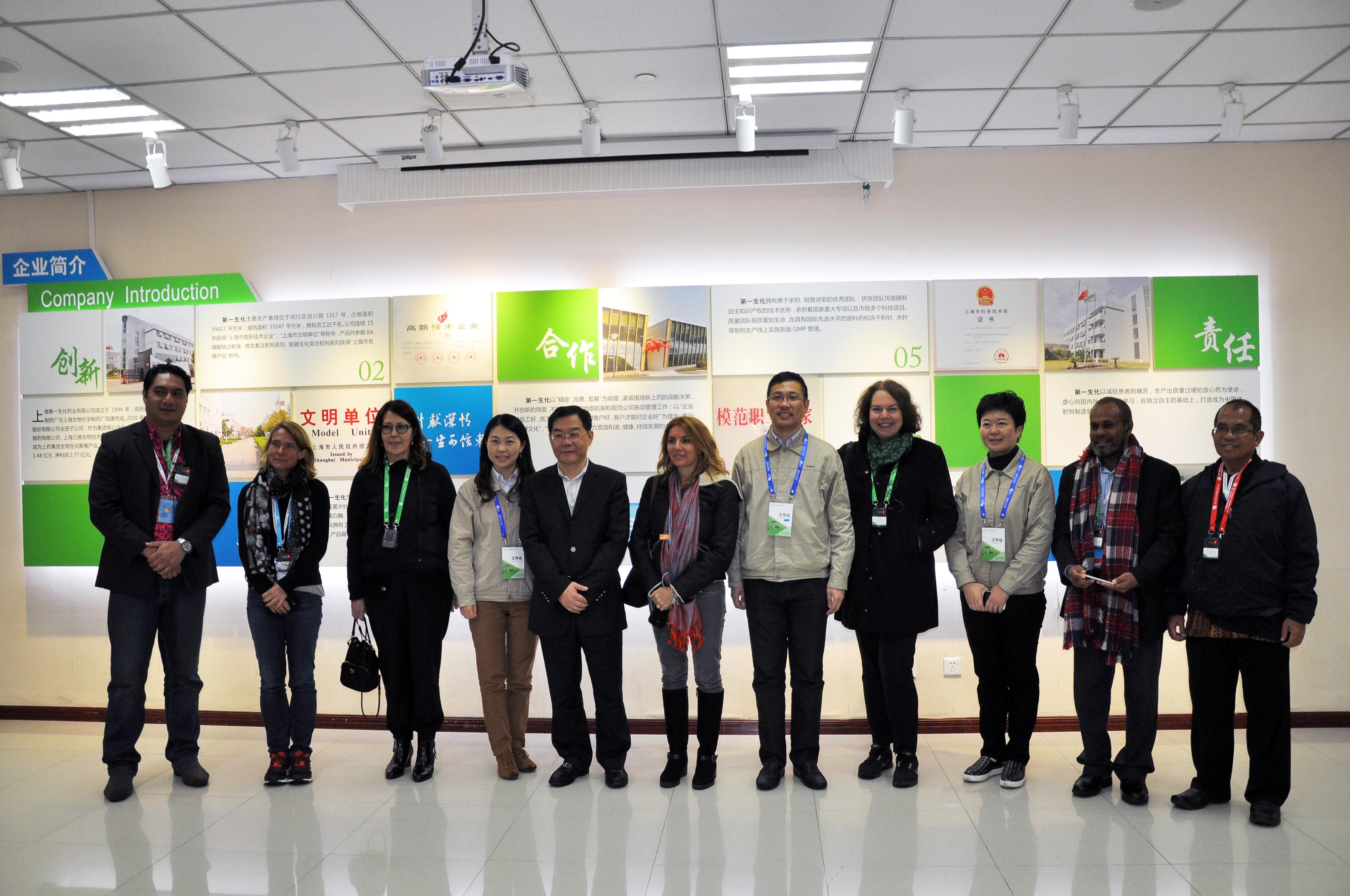 11月23日下午,来自美、德、印度、尼日利亚等各成员国政府、联合国及国际组织、国际金融机构、基金会的受邀代表以及健康及其他与健康决定因素相关的领域的参会代表在闵行区副区长吴志宏的带领下,来到上药第一生化参观交流,了解企业全员健康促进参与情况,公司副总经理汪弼晔、助理总经理何楠、工会主席黄佳音等领导表示了热烈欢迎。