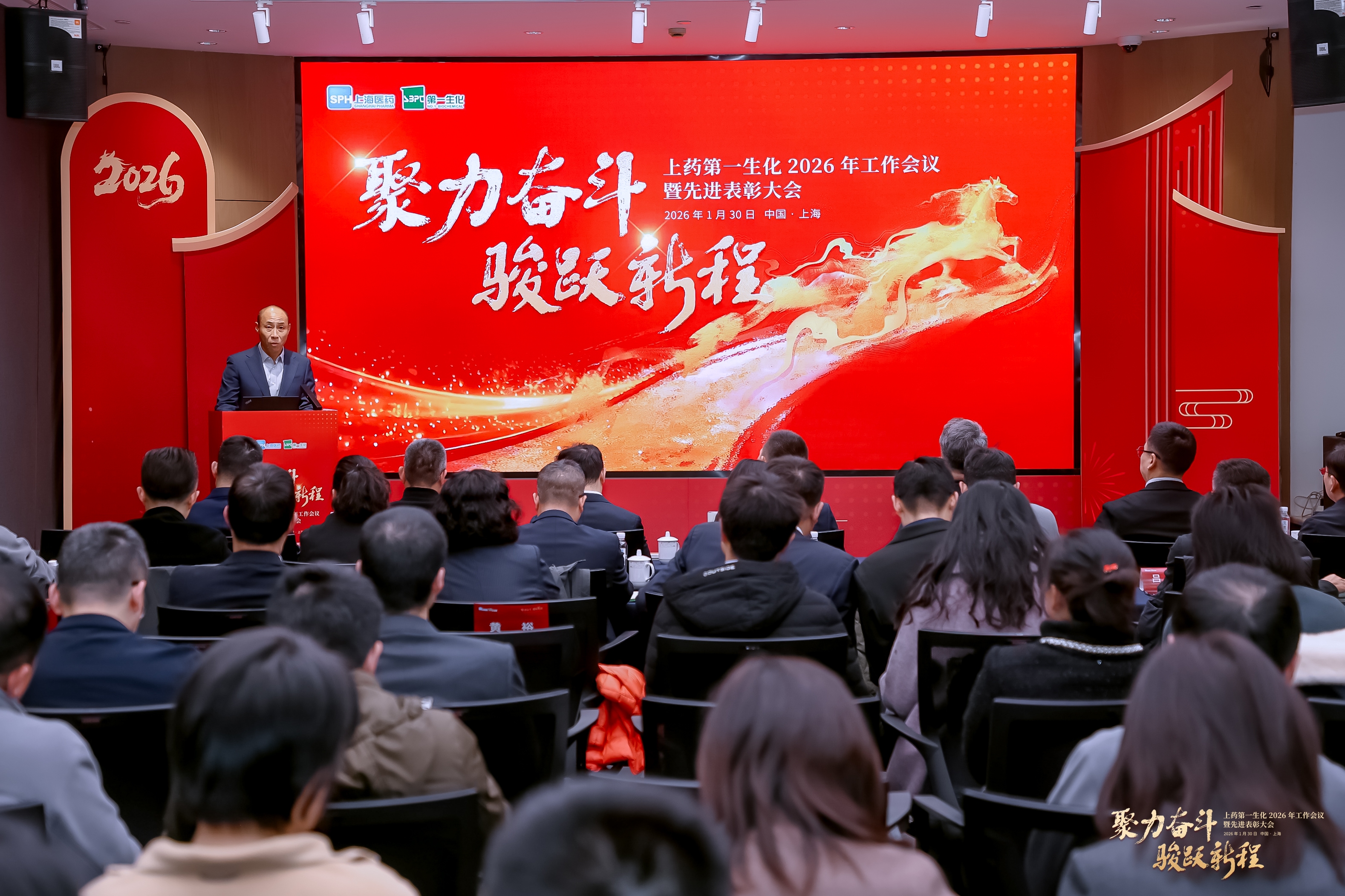 1月30日,上药第一生化召开“聚力奋斗 骏跃新程”2026年工作会议暨先进表彰大会。上海医药副总裁、上药第一生化董事长艾力,上海医药总监、运营管理部总经理严云,上药销售党委书记、总经理牛锐出席会议,与公司党政领导班子成员、中层副职及以上领导人员、员工代表、子公司代表共同回望奋斗足迹、擘画发展新图。会议由上药第一生化纪委书记、工会主席候选人肖在军主持。