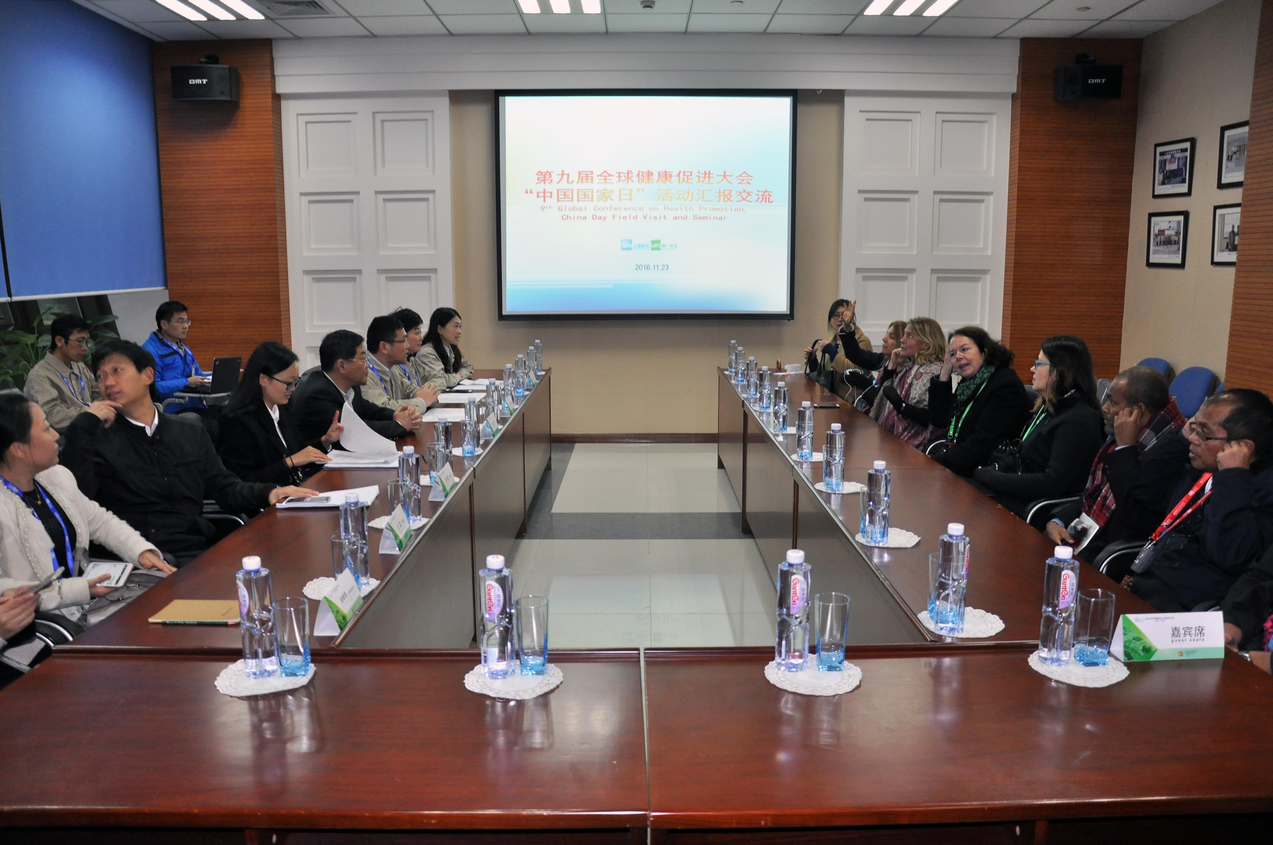 11月23日下午,来自美、德、印度、尼日利亚等各成员国政府、联合国及国际组织、国际金融机构、基金会的受邀代表以及健康及其他与健康决定因素相关的领域的参会代表在闵行区副区长吴志宏的带领下,来到上药第一生化参观交流,了解企业全员健康促进参与情况,公司副总经理汪弼晔、助理总经理何楠、工会主席黄佳音等领导表示了热烈欢迎。